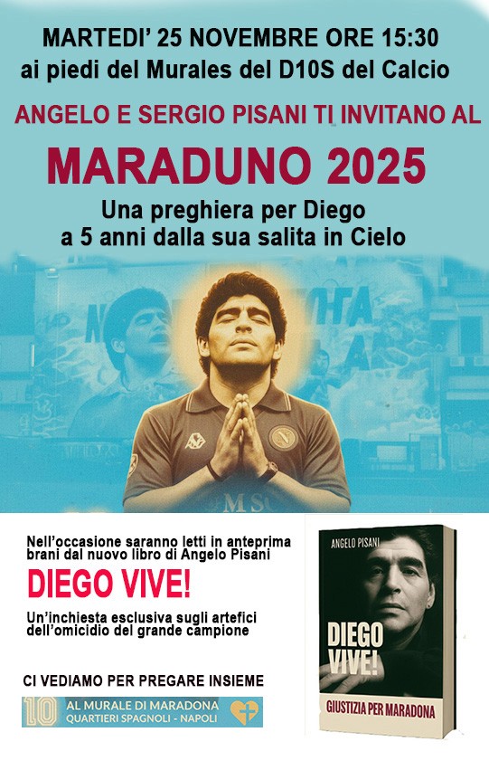 A seguire, saranno letti in anteprima brani dal libro di Angelo Pisani “Diego Vive”, un’inchiesta esclusiva sugli artefici del suo omicidio sotto accusa a Buenos Aires. Poi alle 17 il corteo  in preghiera dal murales di Diego si recherà alla vicina “Pizzoteca“ azzurra per l’evento corale “Diez Natalis “ con intellettuali, giornalisti, attori ed altri che parleranno del loro rapporto con Maradona e dei libri in memoria del campione.